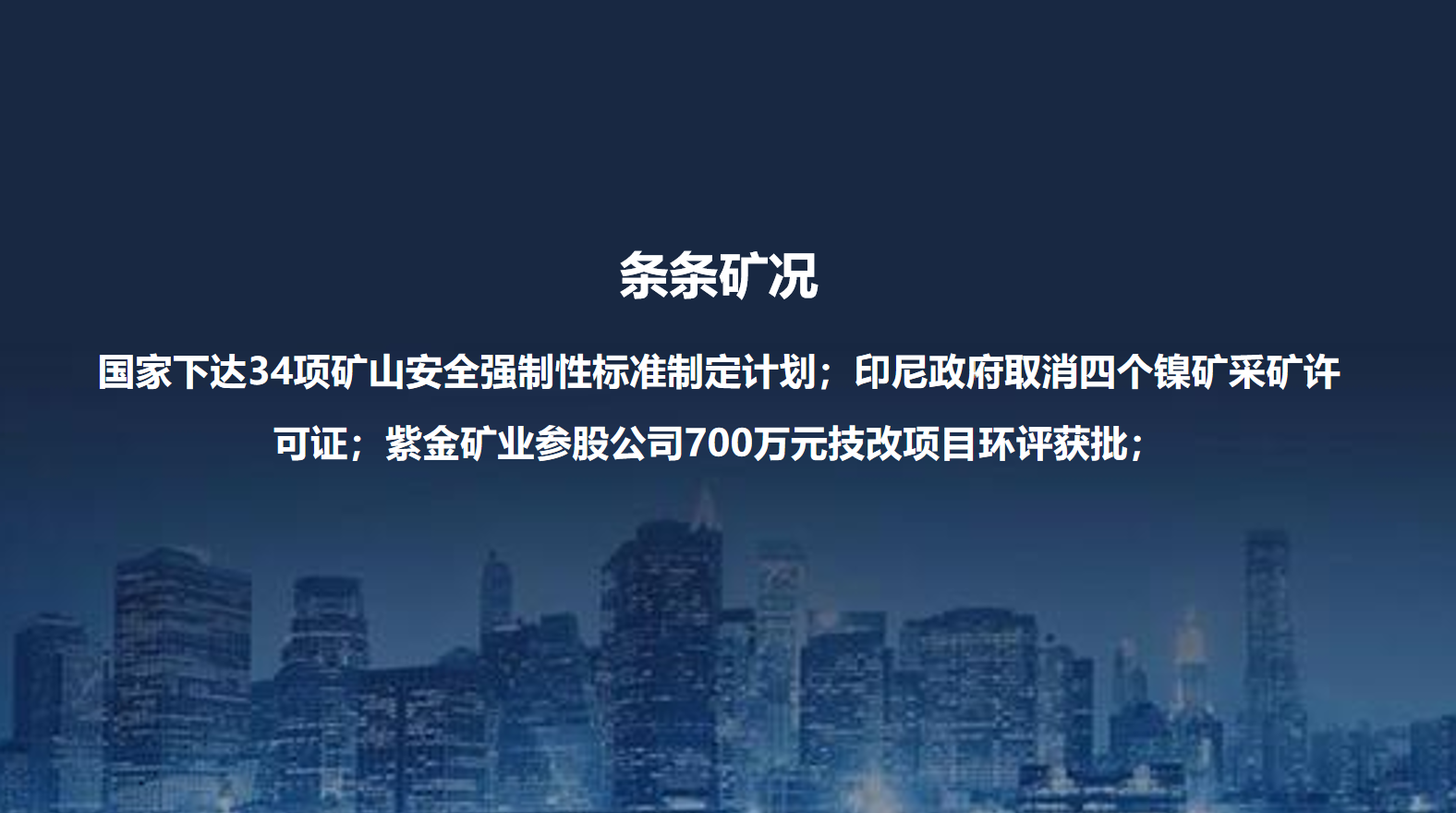 條條礦況|國家下達34項礦山安全強制性標準制定計劃;印尼政府取消四個鎳礦采礦許可證;紫金礦業參股公司700萬元技改項目環評獲批;