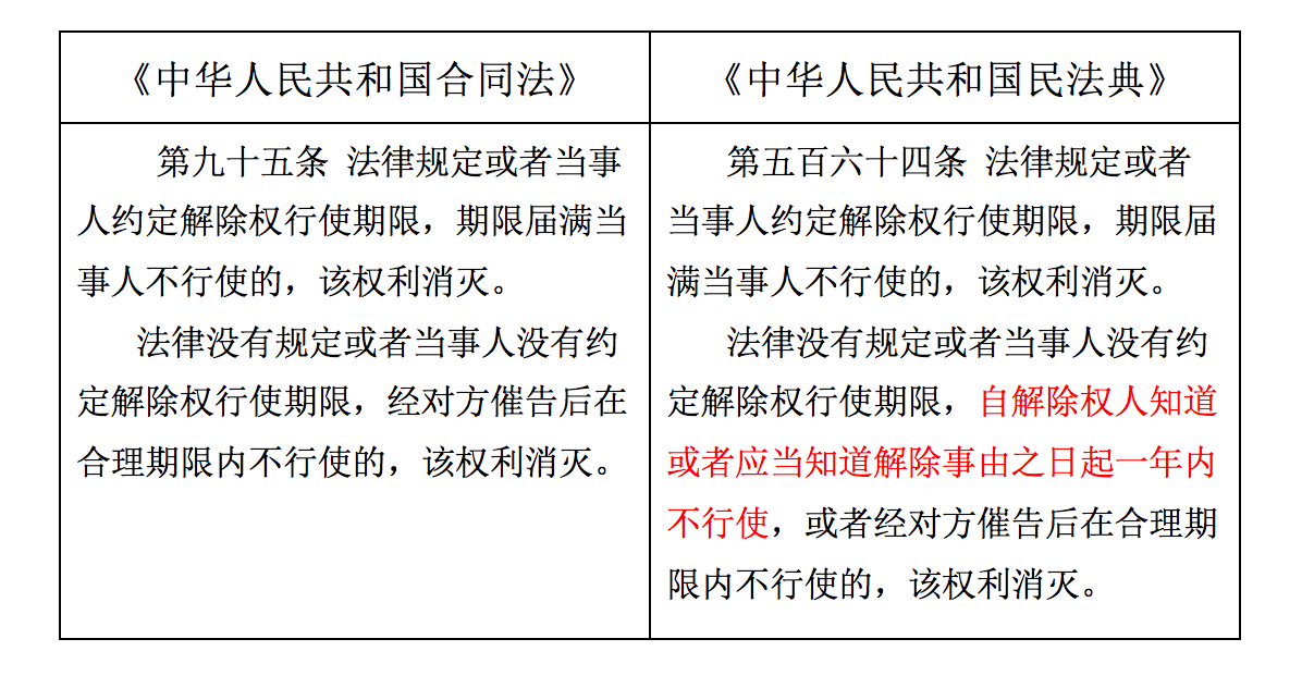 民法典第五百六十四條明確規(guī)定,自解除權(quán)人知道或者應(yīng)當(dāng)知道解除事由之日起一年內(nèi)不行使,該權(quán)利消滅。需要注意的是,在民法典生效之前,合同法并無該項(xiàng)規(guī)定,因此當(dāng)事人應(yīng)重點(diǎn)關(guān)注民法典關(guān)于解除權(quán)行使期限的這一新規(guī)定,嚴(yán)防因未及時(shí)行使解除權(quán)而導(dǎo)致解除權(quán)消滅。