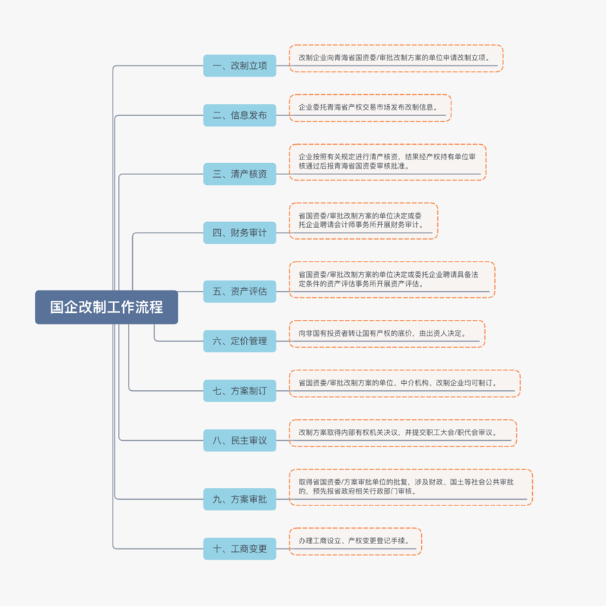 以青海省國有企業(yè)/全民所有制企業(yè)為例,企業(yè)改制主要的工作流程如下: