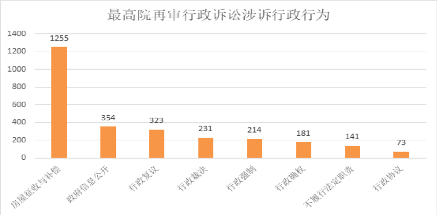 與此前我們發布的2018年、2019年《最高院再審行政訴訟案件大數據報告》相比,房屋征收與補償、政府信息公開、行政復議、行政強制等行政行為依然是最高院再審行政訴訟案件的主要涉訴行政行為。