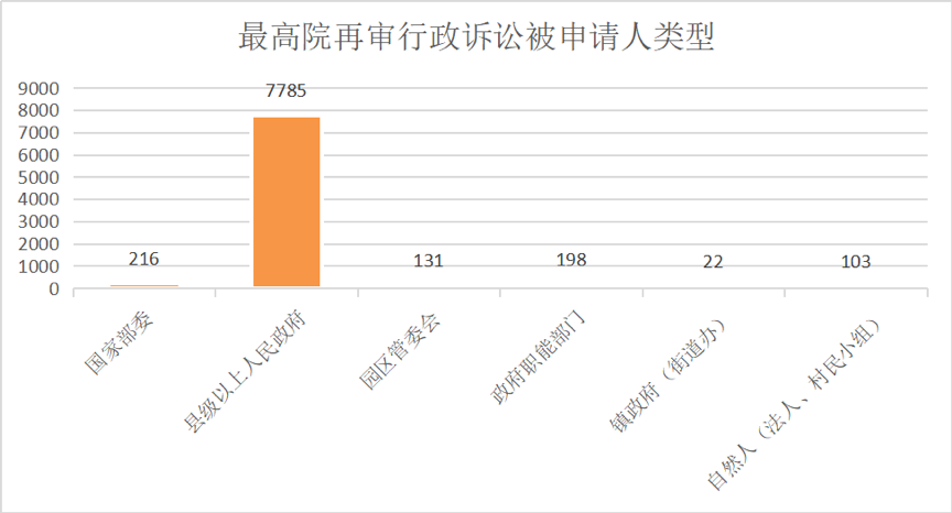 依據上表可以看出,縣級以上人民政府作為基層政府,承擔了龐大的日常行政管理職責,因此,縣級以上人民政府作為被申請人的案件數量較多。我們此前發布的2018年、2019年《最高院再審行政訴訟案件大數據報告》中,縣(區)政府依然是最高院再審行政訴訟案件中最主要的被申請人。基于此,縣(區)政府更應加強法治政府建設、聘請法律顧問為其提供法律服務,防范其法律風險。