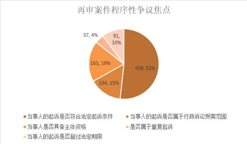 當事人的起訴是否符合法定起訴條件、被告主體是否適格以及當事人的起訴是否屬于行政訴訟受案范圍在所有的爭議焦點中占比達86%。最高院再審案件對于程序性內容審查時,首要審查的是對當事人的起訴是否符合法定起訴條件。同時,審查是否屬于受案范圍并不僅僅依據《最高人民法院關于適用<中華人民共和國行政訴訟法>的解釋》,還結合案件實際情況是否對當事人造成實質影響進行分析。為進一步探究,我們從以下五個方面分析了再審案件程序性審查的爭議焦點: