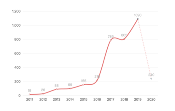 從圖中可以發現,2011年至今,股權激勵相關的案件數量日漸增長,尤其是2016年至2017年、2018年至2019年間,案件數量增長趨勢趨于直線。
