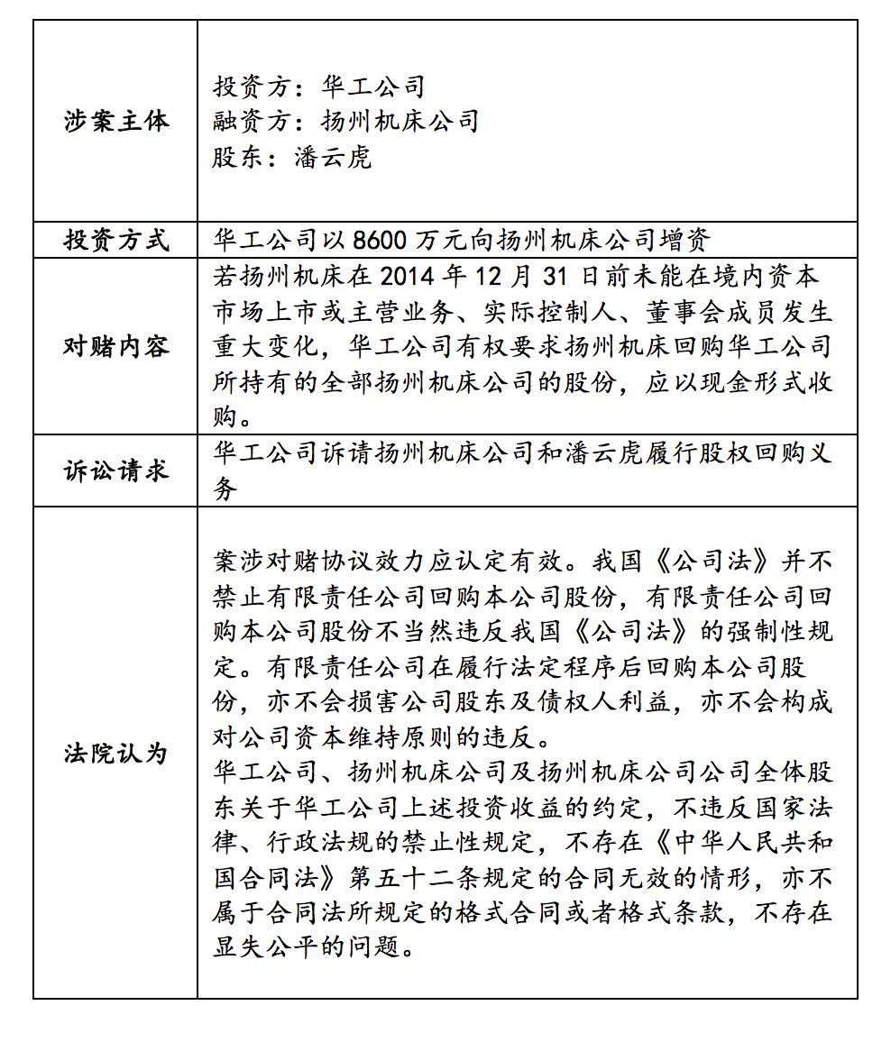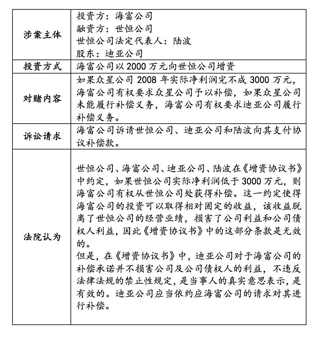 該案件判決后,后續法院對于“對賭協議”效力的判定皆以該案件作為指引,在實踐中總結出“與目標公司對賭無效,與公司股東對賭有效”的裁判規則。