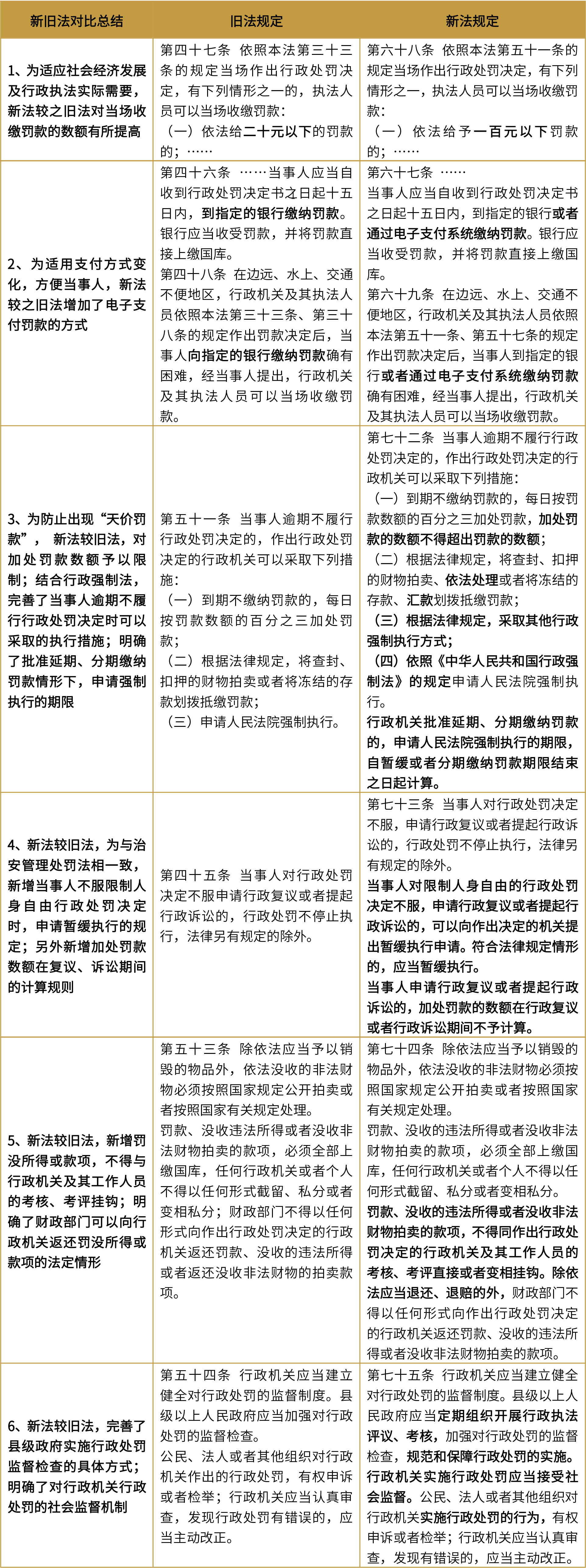 本月15日,新修訂的《中華人民共和國行政處罰法》(以下簡稱“新法”)正式實施,新法較修訂前的《中華人民共和國行政處罰法》(以下簡稱“舊法”),在“行政處罰的執行”規定方面有所變化,新舊法重大變化對比回顧如下: