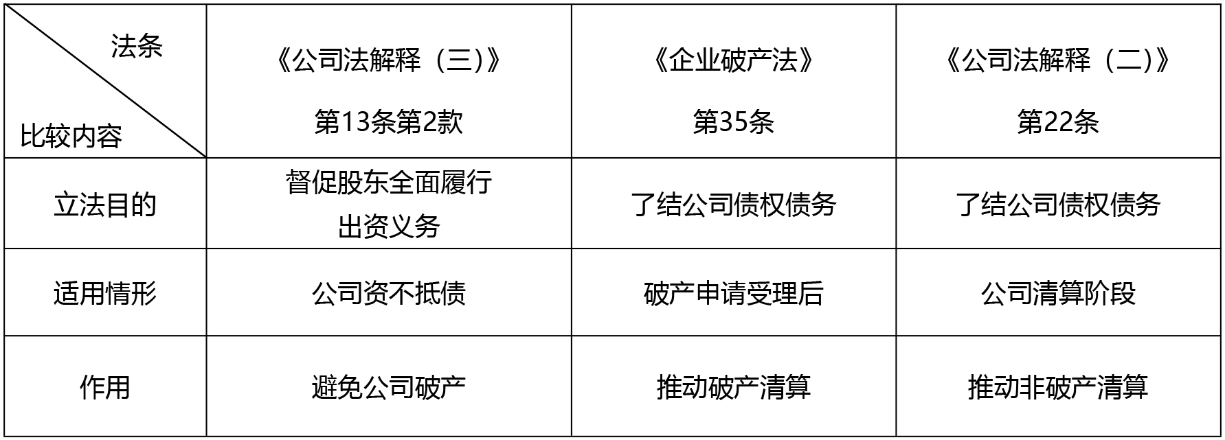 根據我國現行法律規定,公司無論在破產情形下抑或是非破產情形下均可適用出資期限加速到期規則。公司資不抵債情形下,股東是否喪失出資協議中約定的期限利益,最為直接的依據為《企業破產法》第35條之規定,這一規定明確了公司在破產場合下的股東出資義務加速到期規則。同時,《公司法解釋(二)》第22條規定了公司在解散時,股東尚未繳納的出資應當納入清算財產的范圍,并明確尚未繳納的情形包括分期繳納期限尚未屆滿的出資。上述法律明確規定的兩種適用股東出資期限加速到期的條款,均是基于公司清算的目的,即在公司注銷之前了結公司現有的債權債務,因此,無論股東是出于何種原因未繳足出資,此時都有義務按照認繳額繳足。此外,《公司法解釋(三)》第13條第2款也規定了在股東違反出資義務時,對公司債務不能清償部分承擔補充賠償責任,即是為債權人提供的救濟途徑。