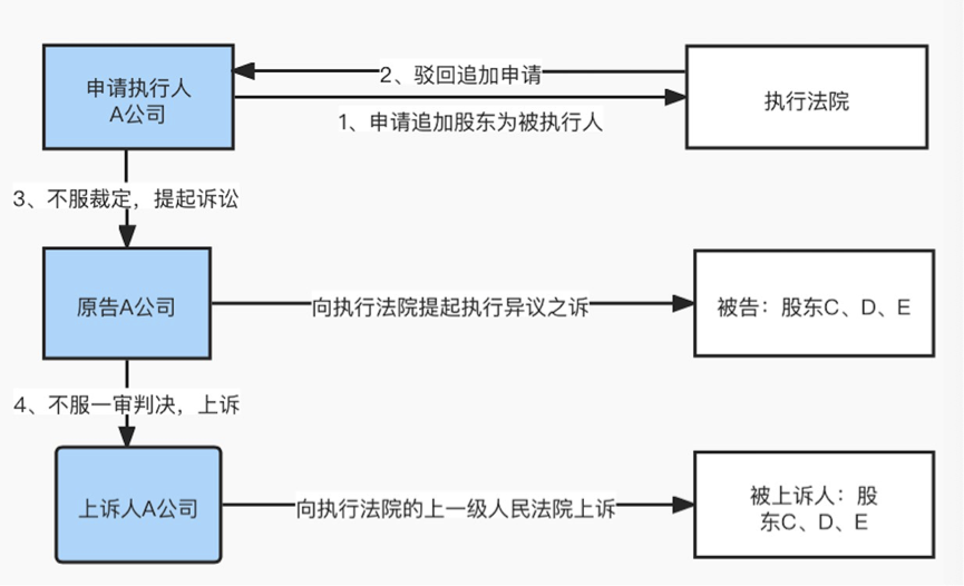 A公司作為申請執(zhí)行人,B公司為被執(zhí)行人,C、D、E為B公司的股東,A公司申請執(zhí)行B公司,且經(jīng)執(zhí)行法院窮盡財產(chǎn)調(diào)查后B公司無可供執(zhí)行的財產(chǎn),執(zhí)行法院告知A公司案件即將終本執(zhí)行。(具體關(guān)系詳見圖一)A公司經(jīng)調(diào)查B公司的工商檔案材料后認為B公司的股東未按照公司章程進行實繳出資(包括實物出資或者債轉(zhuǎn)股的形式),即向執(zhí)行法院申請追加B公司的股東為案件的被執(zhí)行人。經(jīng)執(zhí)行法院審查后,認為A公司現(xiàn)提交的證據(jù)無法證明B公司的四名股東未實繳出資的數(shù)額以及范圍,故裁定駁回了A公司關(guān)于追加B公司四名股東為案件被執(zhí)行人的請求,A公司對此駁回的裁定不服,故依據(jù)《最高人民法院關(guān)于民事執(zhí)行中變更、追加當(dāng)事人若干問題的規(guī)定》第三十二條“被申請人或申請人對執(zhí)行法院依據(jù)本規(guī)定第十四條第二款、第十七條至第二十一條規(guī)定作出的變更、追加裁定或駁回申請裁定不服的,可以自裁定書送達之日起十五日內(nèi),向執(zhí)行法院提起執(zhí)行異議之訴。被申請人提起執(zhí)行異議之訴的,以申請人為被告。申請人提起執(zhí)行異議之訴的,以被申請人為被告。”之規(guī)定,向執(zhí)行法院提起執(zhí)行異議之訴,請求追加A公司四名股東為案件的被執(zhí)行人(具體詳見圖二)