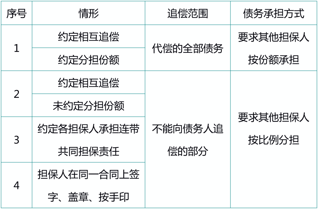 按照上述法律規定確定的相互追償規則,僅在下列四種情形下,擔保人之間可相互追償: