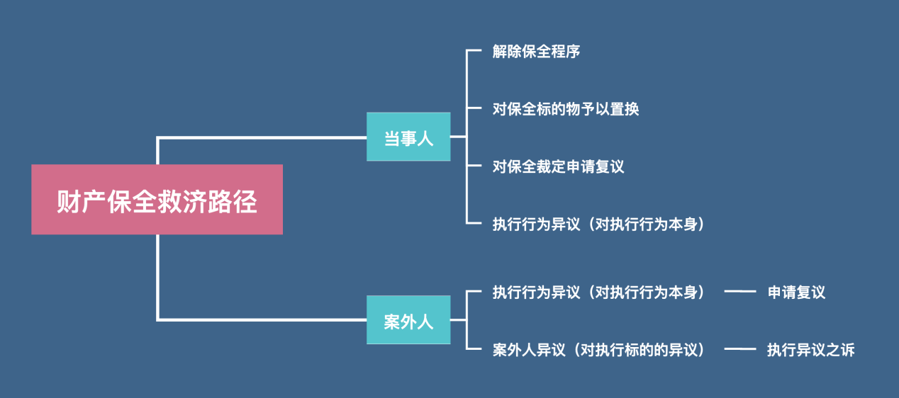 當事人向人民法院申請保全,提供保全財產(chǎn)線索的同時應充分考慮到保全標的物執(zhí)行過程中可能會出現(xiàn)的問題,例如案外人異議、是否接受以物抵債等。就財產(chǎn)保全過程中救濟,作為保全當事人及案外人,可根據(jù)不同的情形選擇不同的救濟途徑。