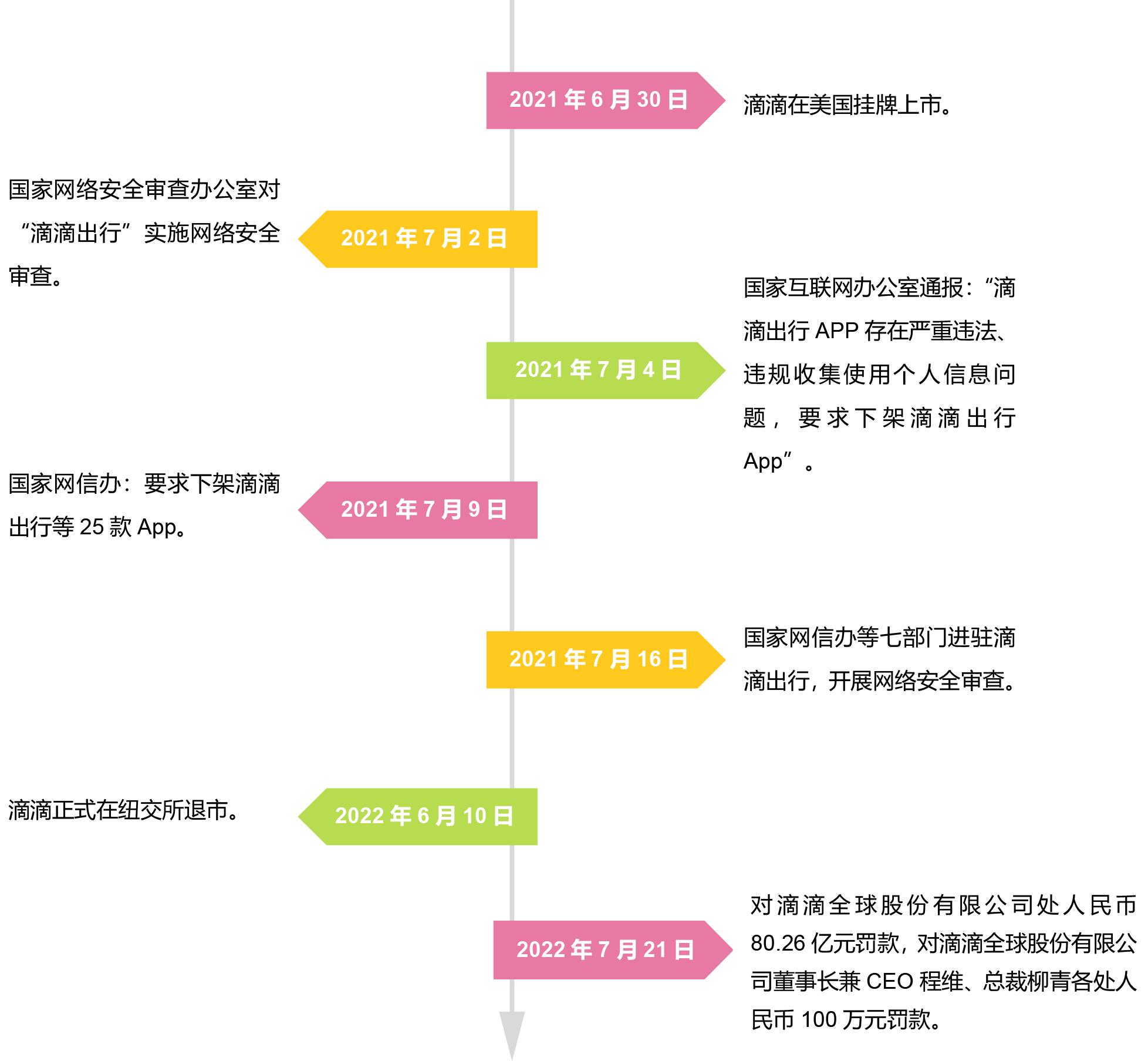 2022年7月21日,國(guó)家互聯(lián)網(wǎng)信息辦公室依據(jù)《網(wǎng)絡(luò)安全法》《數(shù)據(jù)安全法》《個(gè)人信息保護(hù)法》等法律法規(guī),對(duì)滴滴全球股份有限公司處人民幣80.26億元罰款,對(duì)滴滴全球股份有限公司董事長(zhǎng)兼CEO程維、總裁柳青各處人民幣100萬(wàn)元罰款。