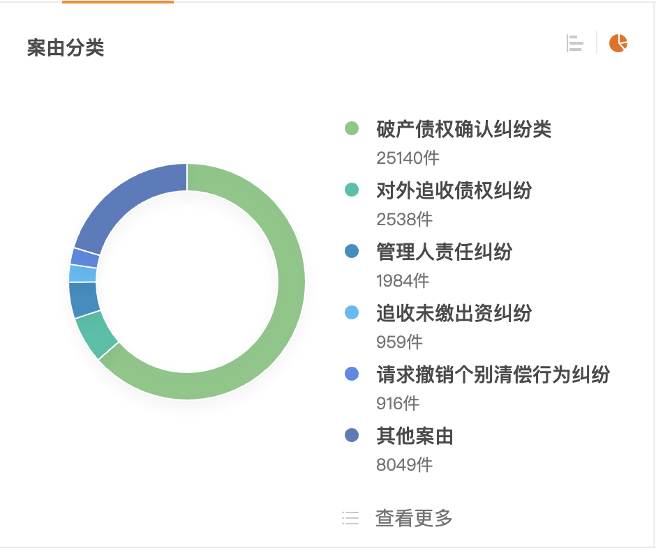 以“與破產有關的糾紛”作為案例檢索的關鍵詞,檢索范圍鎖定為2020年1月1日至2022年8月3日,在alpha數據庫檢索到民事案件總額39,500件,其中破產債權確認糾紛25,140件、對外追收債權糾紛2,538件、管理人責任糾紛1,984件、追收未繳出資糾紛959件、請求撤銷個別清償行為糾紛916件,物權糾紛、侵權責任糾紛等其他案由糾紛8,049件。如下圖所示: