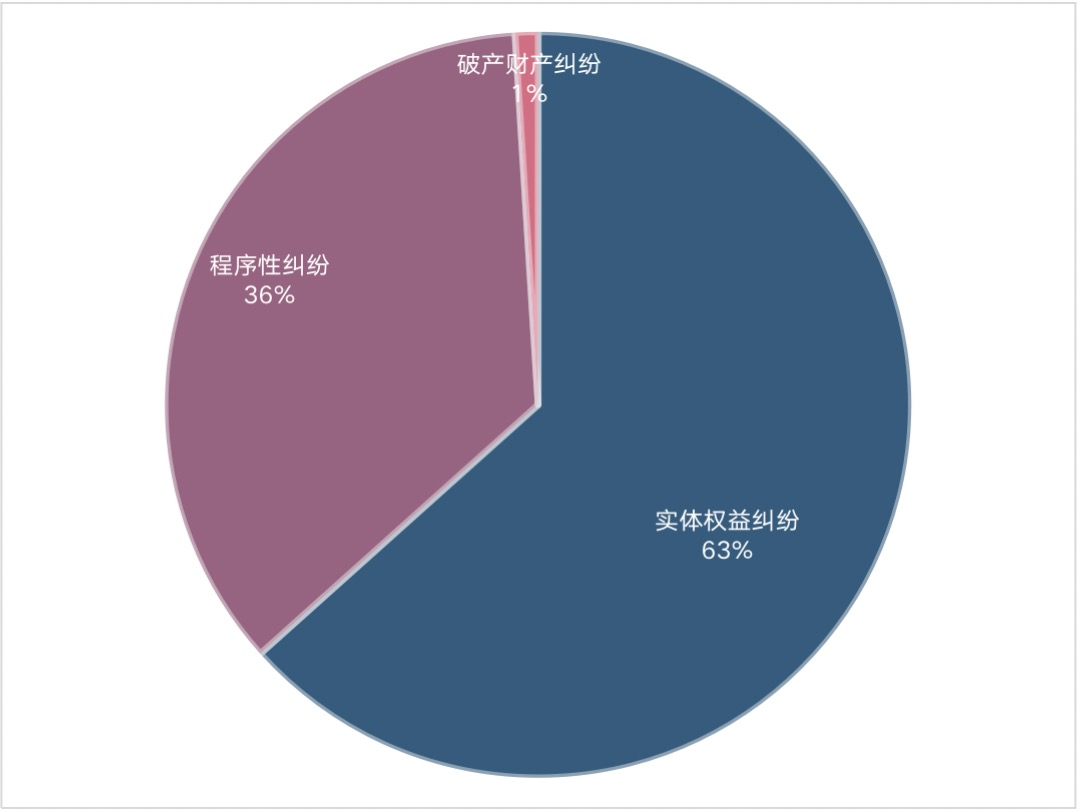 我們針對2020年以來的破產債權確認糾紛類17,900件案例進行系統分析,主要劃分為三類,即實體權益類糾紛11,368件,占比63%;與破產程序相關的糾紛6,378件,占比36%;與債務人財產有關糾紛包括別除權、撤銷權和取回權等糾紛154件,占比1%。