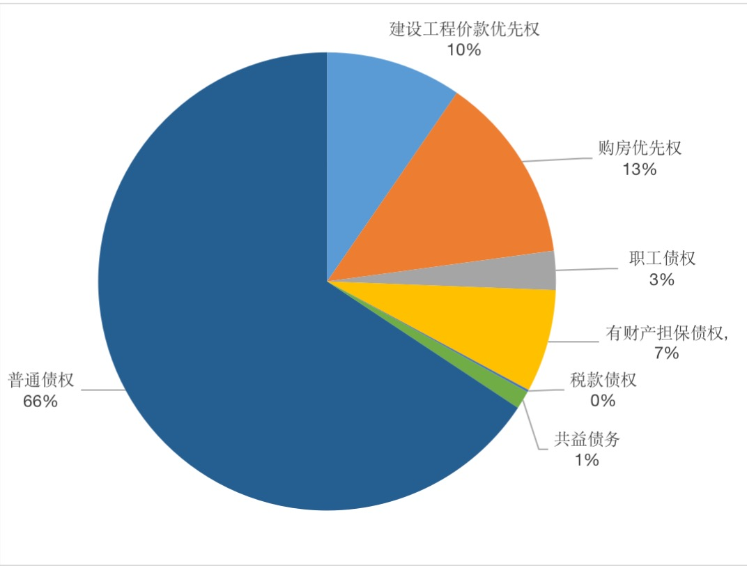 在11,368件實體權益糾紛案件中,按照破產法中的權益性質即共益債務、購房優先權、建設工程價款優先權、有財產擔保債權、職工債權、稅款債權、普通債權劃分,具體情況如下: