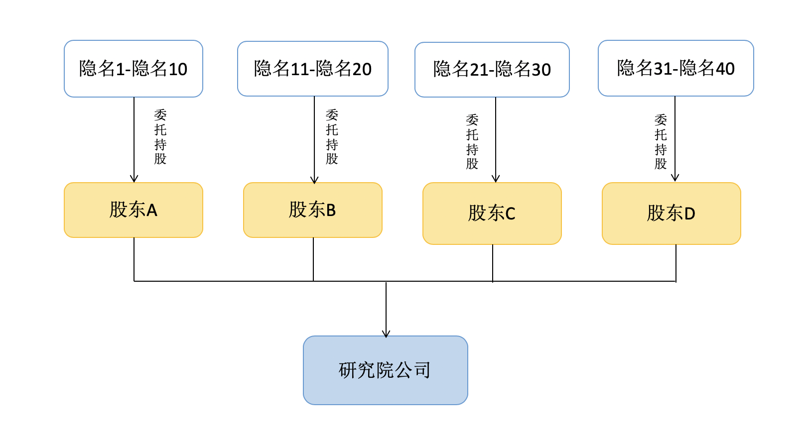 以某研究院公司為例,大股東A、B、C、D均直接持有研究院公司股權(quán),小股東1至小股東40共四十人分別由股東A、B、C、D代持,如圖所示: