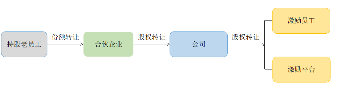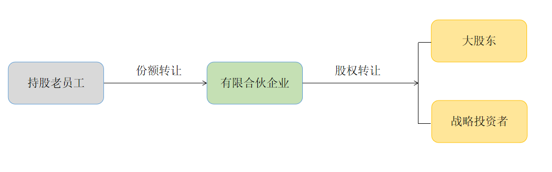 間接持股情況下,持股老員工可以通過將其持有的有限合伙企業(yè)份額轉(zhuǎn)讓給其他股東、有限合伙企業(yè)的合伙人或公司引進(jìn)的戰(zhàn)略投資者,實(shí)現(xiàn)其退出合伙企業(yè),如圖所示: