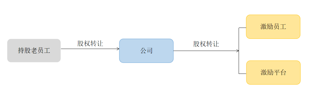 直接持股和股權(quán)代持情況下,公司回購持股老員工(直接持股的股東或隱名股東)的股權(quán),實(shí)現(xiàn)老員工退出。公司回購的股權(quán)用于股權(quán)激勵或員工持股計(jì)劃,分配(轉(zhuǎn)讓)給公司擬激勵的員工(激勵平臺),如圖所示:
