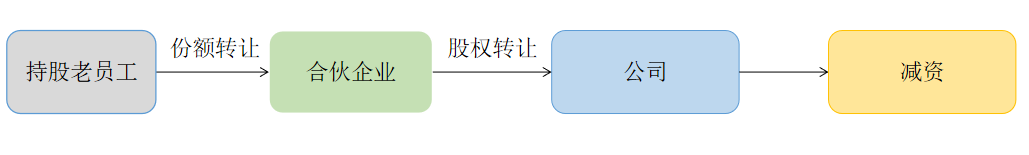 間接持股情況下,公司回購合伙企業(yè)持有的公司股權(quán),并在半年內(nèi)完成減資;合伙企業(yè)回購持股老員工持有的合伙企業(yè)的份額,并以從公司收取的股權(quán)回購款向持股老員工支付回購合伙份額的對價(jià)款,持股老員工退出合伙企業(yè),實(shí)現(xiàn)持股老員工退出間接持股,如圖所示: