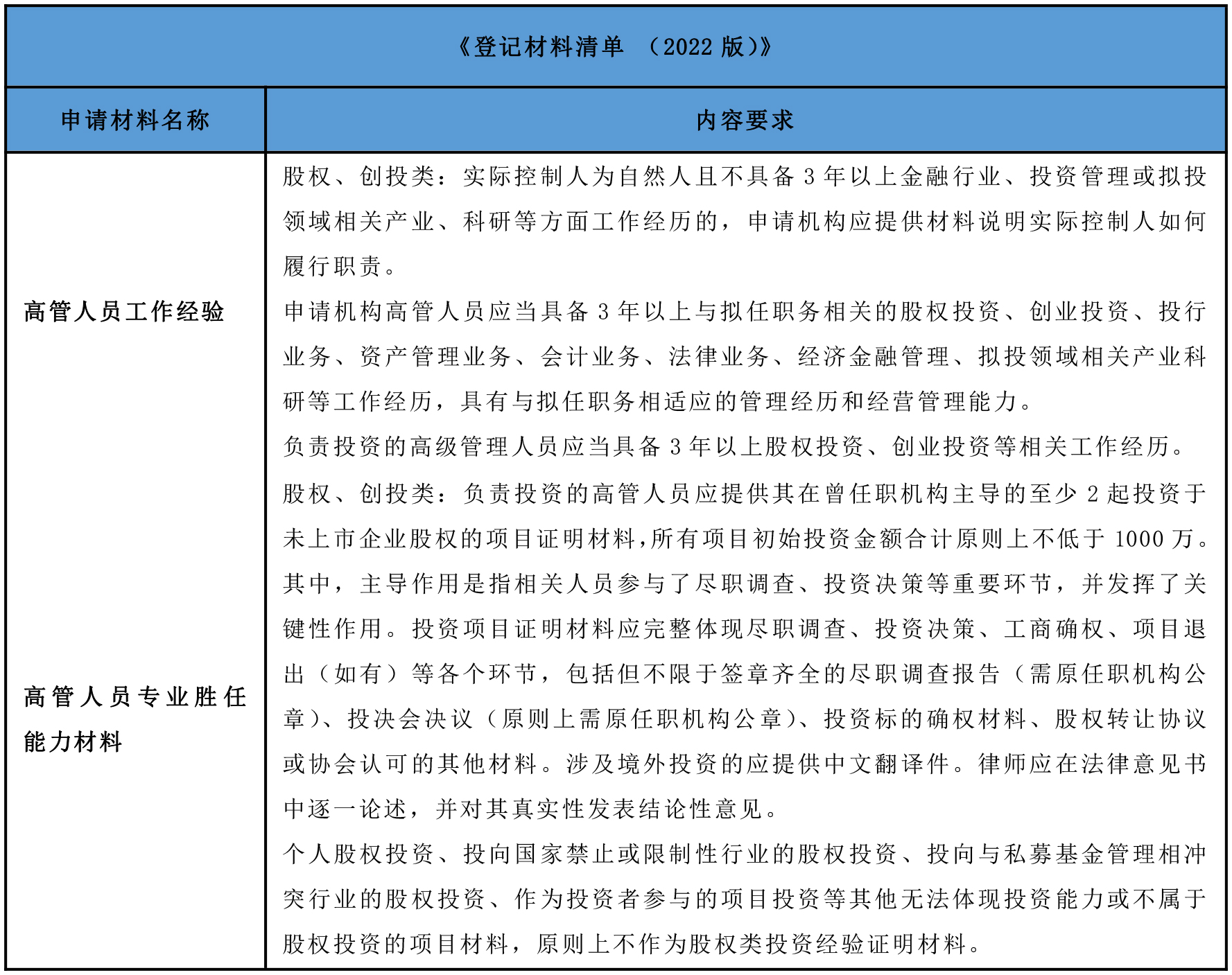 《申請材料清單(2020版)》中要求申請機構提交股權項目成功退出的證明材料,申請機構的高管過往曾經參與的投資項目未必都已成功退出,或還在存續中。《登記材料清單(2022版)》已不強調項目是否已退出。