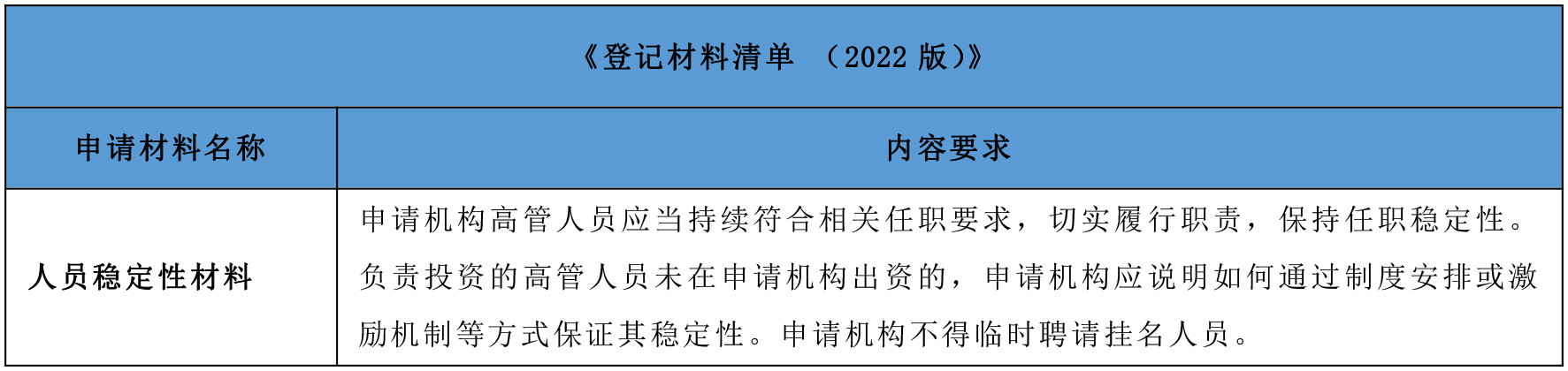 在《登記材料清單(2022版)》中新增關于高管人員穩定性的要求,要求申請機構進一步說明如何通過制度安排或激勵機制等方式保證高管人員的穩定性。同時為了避免實務中很多申請機構在登記申請前通過掛名方式聘請高管人員并在登記申請通過后更換高管人員的情況,《登記材料清單(2022版)》中進一步明確申請機構不得臨時聘請掛名人員。