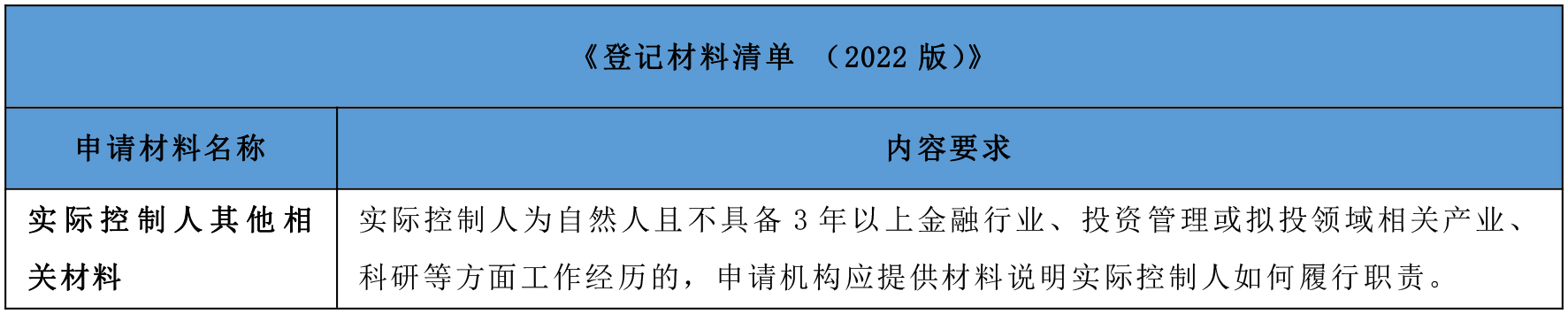 在《登記材料清單 (2022版)》中,《申請材料清單(2020版)》的上述內容已經被刪除,但中基協要求如自然人實際控制人不具備3年以上金融行業、投資管理或擬投領域相關產業、科研等方面工作經歷,則申請機構應提供材料說明實際控制人如何履行職責。