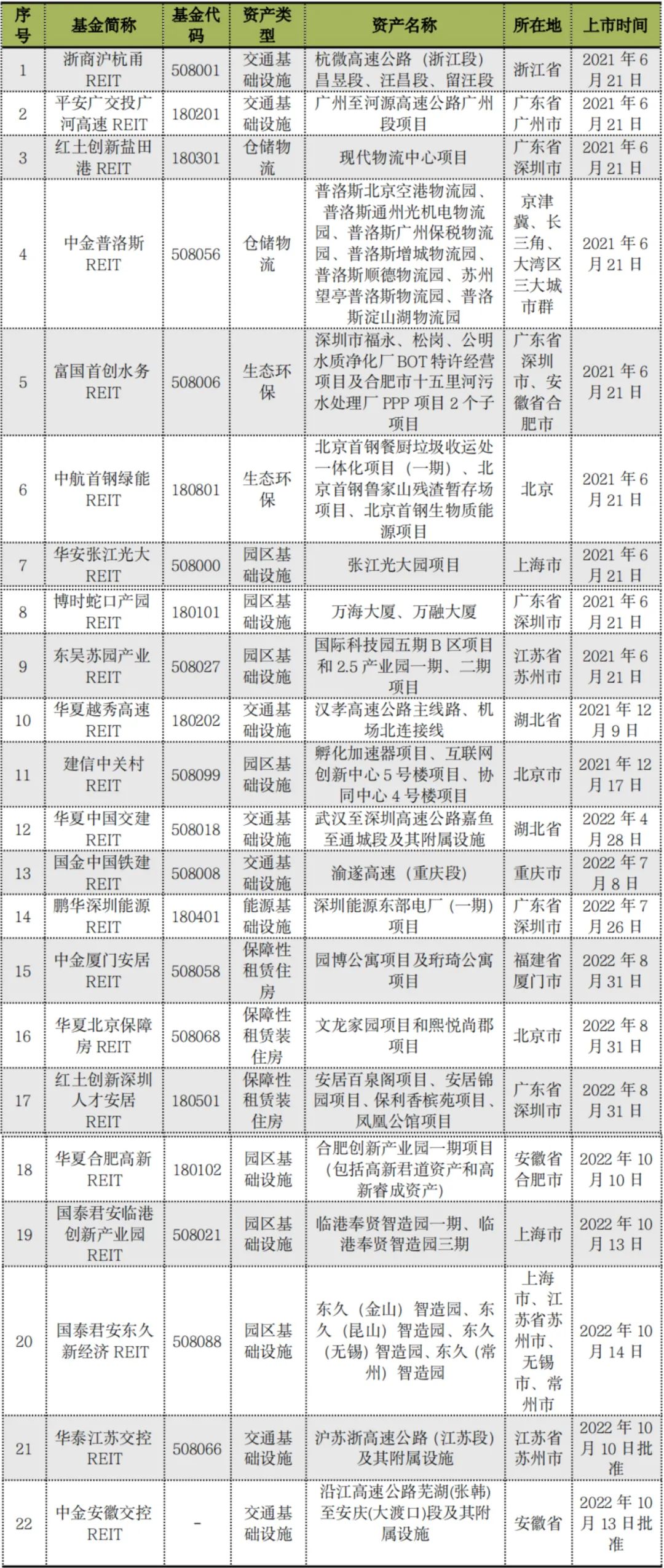截至2022年10月18日,市場上成功發售的基礎設施公募REITs已經增至22只,已上市公募REITs的底層項目涵蓋產業園區、倉儲物流、高速公路、環保水務、清潔能源、保障性租賃住房等六大行業類型。具體情況如下: