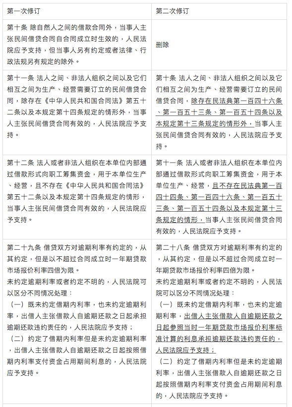 2020年12月29日,最高人民法院頒布了《最高人民法院關于審理民間借貸案件適用法律若干問題的規定(2020年第二次修訂)》(以下簡稱“《民間借貸司法解釋第二次修訂》”),并于2021年1月1日起正式施行。本次修訂距離最高人民法院于2020年8月19日頒布并于2020年8月20日正式施行的《最高人民法院關于審理民間借貸案件適用法律若干問題的規定(2020修訂)》(以下簡稱“《民間借貸司法解釋第一次修訂》”)過去不到五個月,那么兩次修訂又有什么不同呢?通過比對兩次修訂內容,可發現如下條款發生了變更: