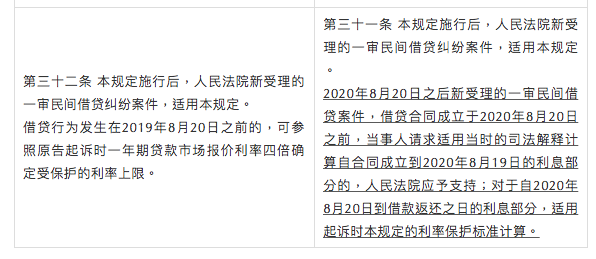 《民間借貸司法解釋第一次修訂》采用一年期貸款市場報價利率的四倍,從而取代了舊規中的“兩線三區”標準,而就目前已經公布的一年期貸款市場報價利率的標準來看,其四倍遠遠低于舊規中年利率24%的標準。該情形導致實踐中就新舊規范的銜接與適用出現了不小的爭議。據此,《民間借貸司法解釋第二次修訂》對此進行了修改及明確。
