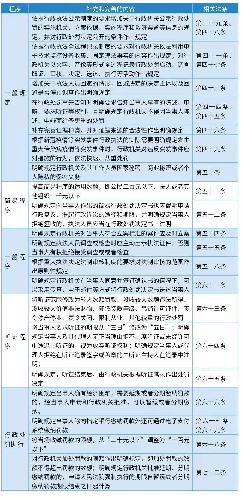 新《行政處罰法》對舊《行政處罰法》的實施程序進行了補充和完善,補充完善后的具體內(nèi)容如下: