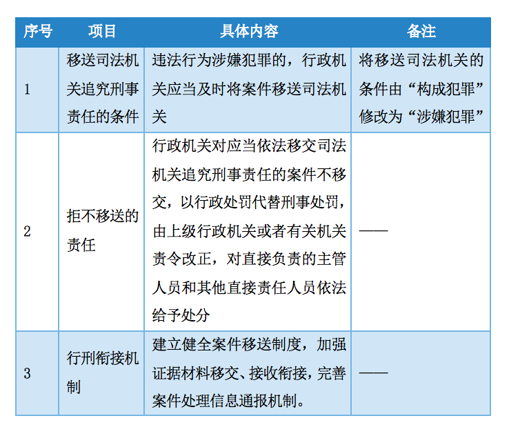 新《行政處罰法》第二十七條、第八十二條對舊《行政處罰法》規(guī)定的對行刑銜接制度從移送司法追究刑事責任的條件、拒不移送的責任以及行刑銜接機制等方面進行了補充完善,具體補充完善內(nèi)容為: