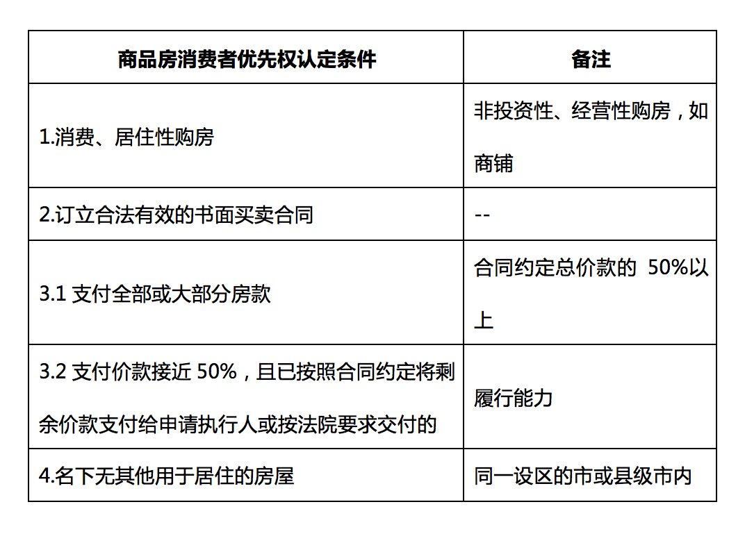 根據《最高人民法院關于人民法院辦理執行異議和復議案件若干問題的規定》、《全國法院民商事審判工作會議紀要》(以下簡稱《紀要》)規定,建工承包人的優先權優于抵押權和其他債權,而商品房消費者支付大部分款項后,承包人的建工優先受償權不得對抗買受人。同時,《紀要》第126條提出,商品房消費者的優先權是為保護消費者生存權而作出的例外規定,必須嚴格把握條件,避免擴大范圍,商品房消費者應當僅限于《紀要》第125條規定。根據以上規定,筆者認為,雖然《批復》被廢止,但根據現行有效的司法解釋和指導意見,滿足以下條件的商品房消費者應當享有優于建設工程優先受償權和抵押權的優先權: