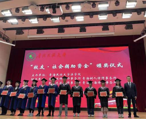活動在學生代表發言中拉開序幕,近些年青海民族大學法學院涌現出一批優秀畢業生與先進典型,他們用自己的努力生動詮釋了“進德修業,自強不息”的校訓精神,為獎勵優秀,鼓勵先進,青海民族大學法學院決定授予2021屆優秀畢業生“校友/社會捐助資金”,其中樹人獎勵金由我所蔡賢龍律師為獲獎同學頒發。