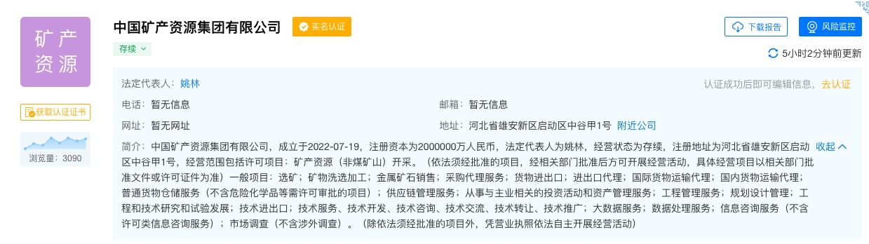 中國礦產資源集團有限公司于今日(7月19日)成立,注冊資本為200億人民幣,法定代表人姚林。注冊地為雄安新區;經營范圍主要為礦產資源(非煤礦山)開采。