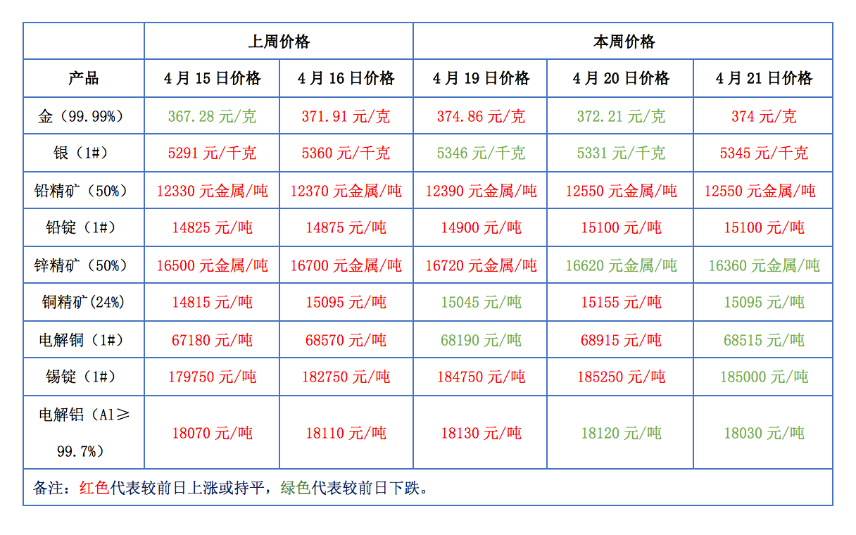 下表為本周金、銀、鉛、鋅、銅、鋁等主要有色金屬礦產品價格變動情況: