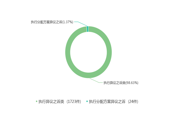 從法院確定的案由來看,執(zhí)行異議之訴當(dāng)前的案由分布由多至少分別是執(zhí)行異議之訴,執(zhí)行分配方案異議之訴。