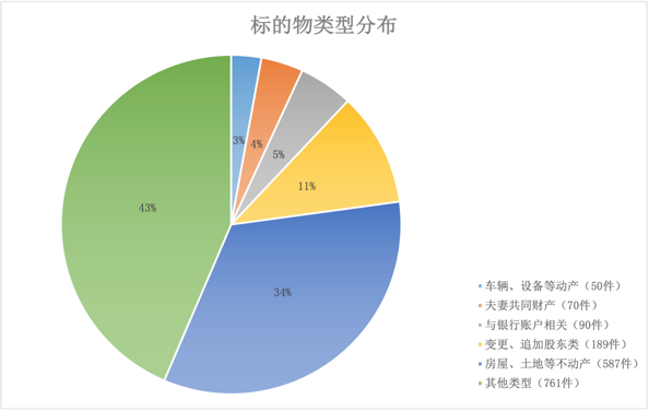 從標(biāo)的物類型分布情況來看,執(zhí)行異議之訴爭(zhēng)議的標(biāo)的物類型主要為:(1)房屋、土地等不動(dòng)產(chǎn);(2)變更、追加股東;(3)銀行賬戶相關(guān);(4)夫妻共同財(cái)產(chǎn);(4)車輛、設(shè)備等較高價(jià)值的動(dòng)產(chǎn)。