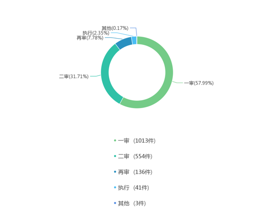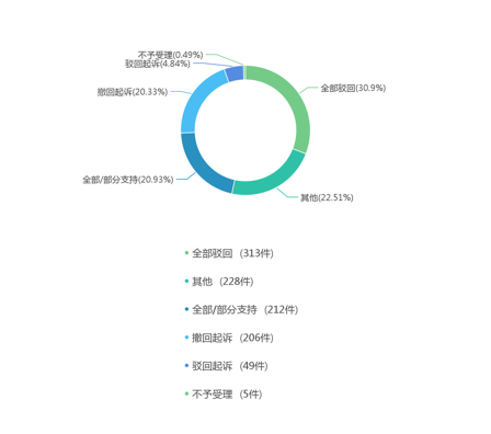 從一審裁判結(jié)果可以看到,全部駁回的有313件,占比為30.90%;其他的有228件,占比為22.51%;全部/部分支持的有212件,占比為20.93%。