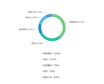 從二審裁判結(jié)果可以看到,維持原判的有214件,占比為38.63%;其他的有157件,占比為28.34%;發(fā)回重審的有70件,占比為12.64%。