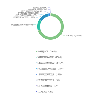 從標(biāo)的額可以看到,標(biāo)的額為50萬(wàn)元以下的案件數(shù)量最多,有791件,50萬(wàn)元至100萬(wàn)元的案件有158件,100萬(wàn)元至500萬(wàn)元的案件有145件,1千萬(wàn)元至2千萬(wàn)元的案件有15件,500萬(wàn)元至1000萬(wàn)元的案件有14件。