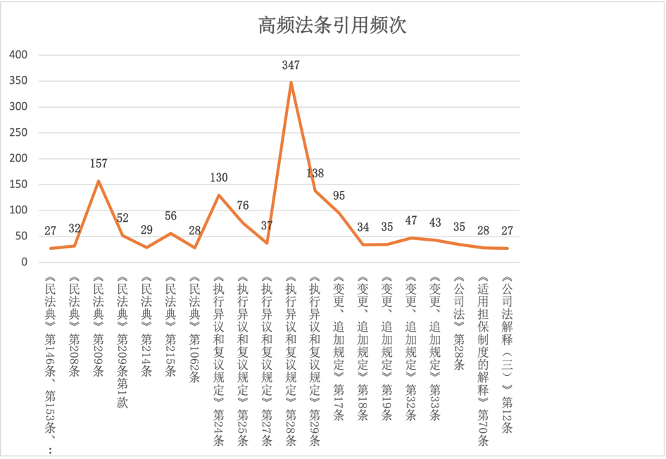 此處我們統(tǒng)計(jì)了執(zhí)行異議之訴案件中被援引的高頻法條,其中,高頻實(shí)體法條情況如下(鑒于本報(bào)告發(fā)布于民法典實(shí)施之后,本所律師已對(duì)相關(guān)法條進(jìn)行了同步更新):