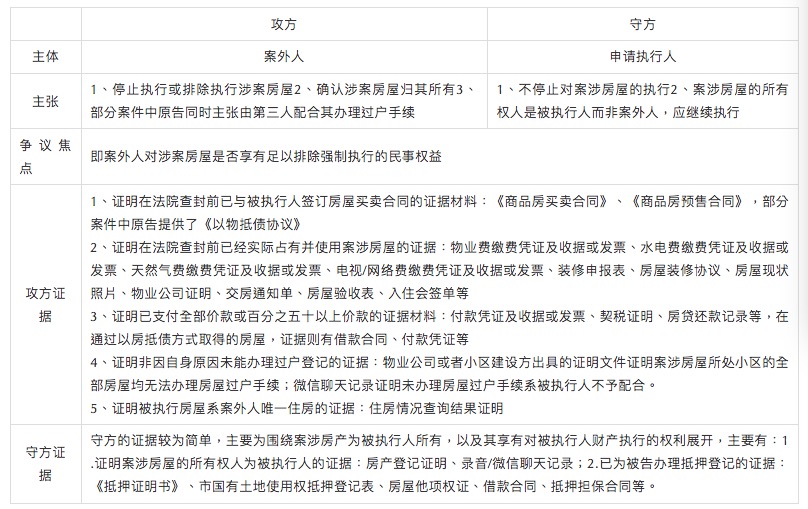 根據起訴主體的不同,案外人與申請執行人的訴辯主張、證據情況等均有所不同,但無論是哪一方提起訴訟,參與對抗的兩方主體基本固定,即:主張停止執行或排除執行涉案房屋的,在此類案件中可作為攻方當事人;而主張不應停止或繼續對涉案房屋執行的,在此類案件中可作為守方當事人。具體如下: