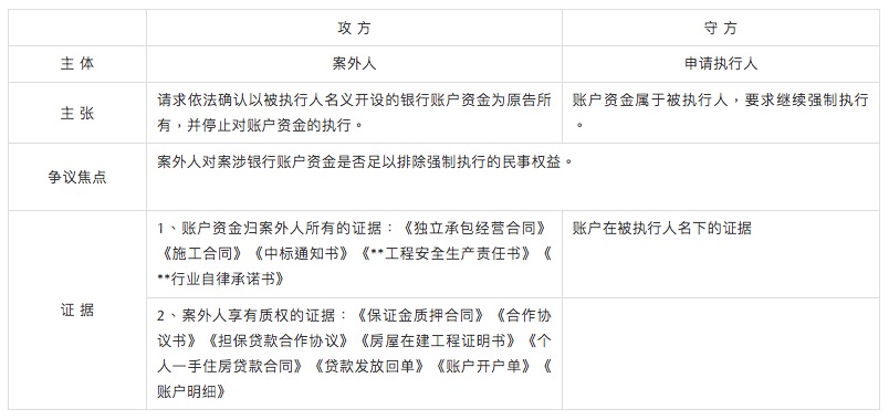 根據起訴主體的不同,雖訴辯主張、證據組織等均有不同,但參與對抗的兩方主體基本固定,即:請求依法確認以被執行人名義開設的銀行賬戶資金為其所有,并要求排除強制執行的為攻方;申請對被執行人銀行賬戶資金繼續執行的為守方。