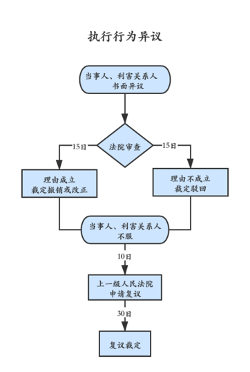 《民事訴訟法》第二百二十五條規定:“當事人、利害關系人認為執行行為違反法律規定的,可以向負責執行的人民法院提出書面異議。當事人、利害關系人提出書面異議的,人民法院應當自收到書面異議之日起十五日內審查,理由成立的,裁定撤銷或者改正;理由不成立的,裁定駁回。當事人、利害關系人對裁定不服的,可以自裁定送達之日起十日內向上一級人民法院申請復議。”