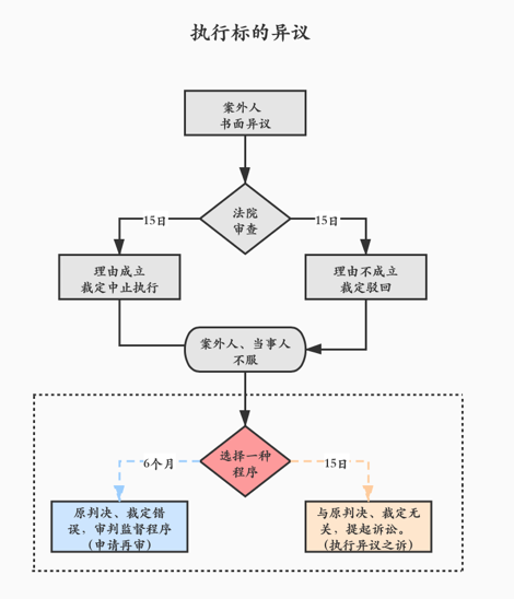 《民事訴訟法》第二百二十七條規定:“執行過程中,案外人對執行標的提出書面異議的,人民法院應當自收到書面異議之日起十五日內審查,理由成立的,裁定中止對該標的的執行;理由不成立的,裁定駁回。案外人、當事人對裁定不服,認為原判決、裁定錯誤的,依照審判監督程序辦理;與原判決、裁定無關的,可以自裁定送達之日起十五日內向人民法院提起訴訟。”