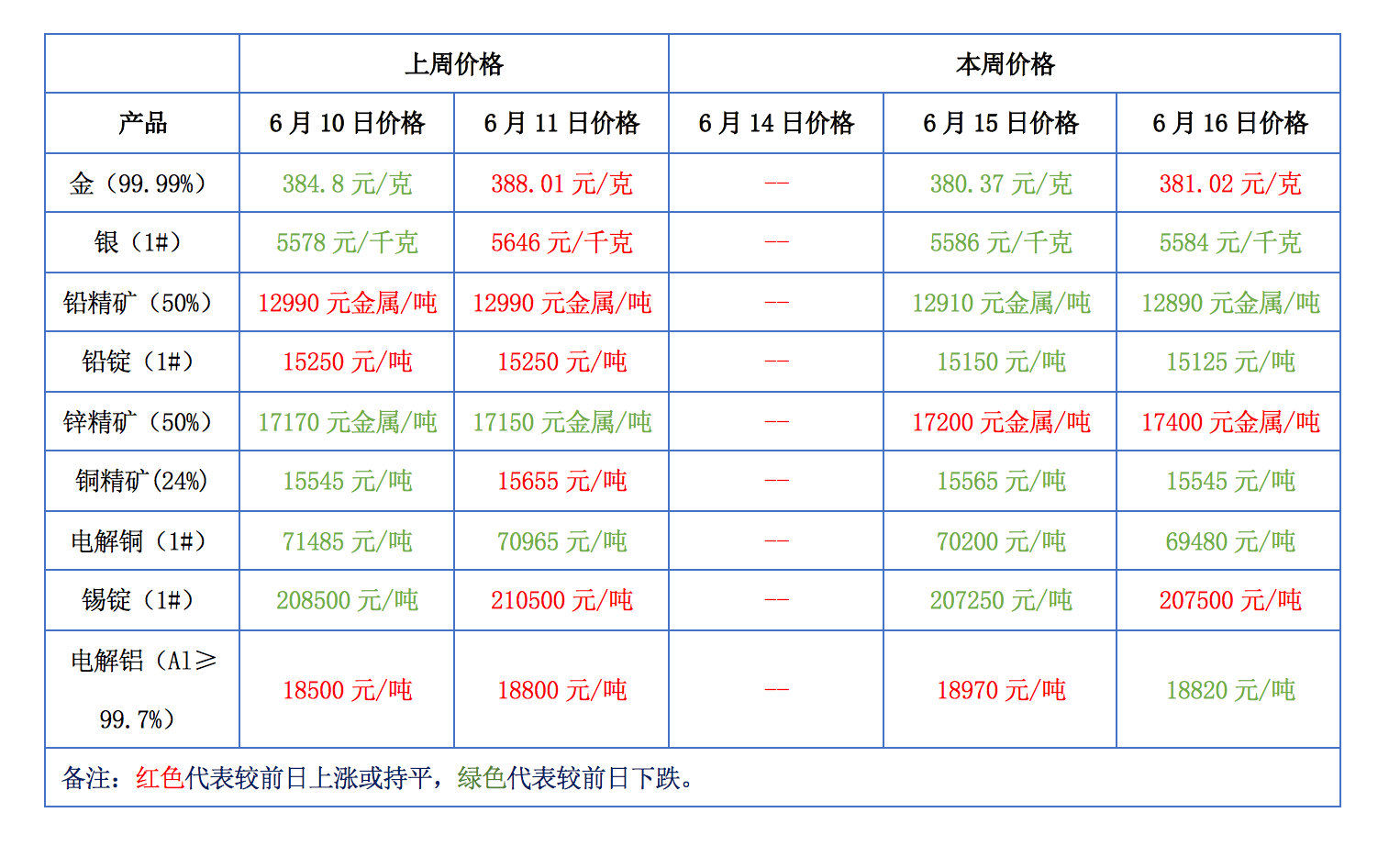 下表為本周金、銀、鉛、鋅、銅、鋁等主要有色金屬礦產品價格變動情況:
