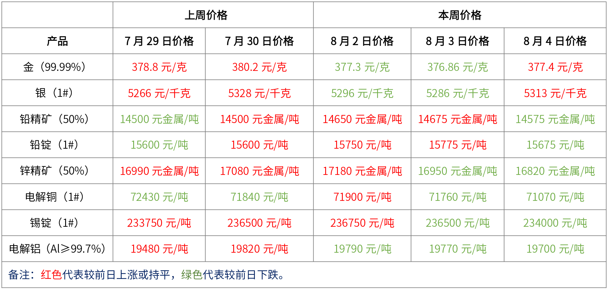 金、銀、鉛、鋅、銅、鋁等主要金屬本周報價。