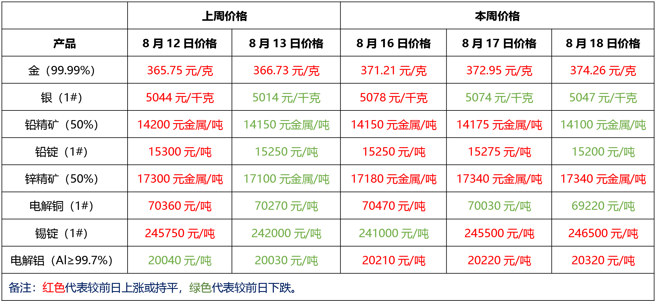 金、銀、鉛、鋅、銅、鋁等主要金屬本周報價