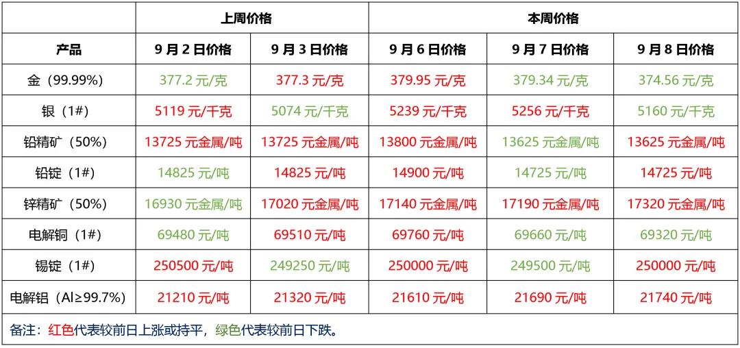 金、銀、鉛、鋅、銅、鋁等主要金屬本周報價