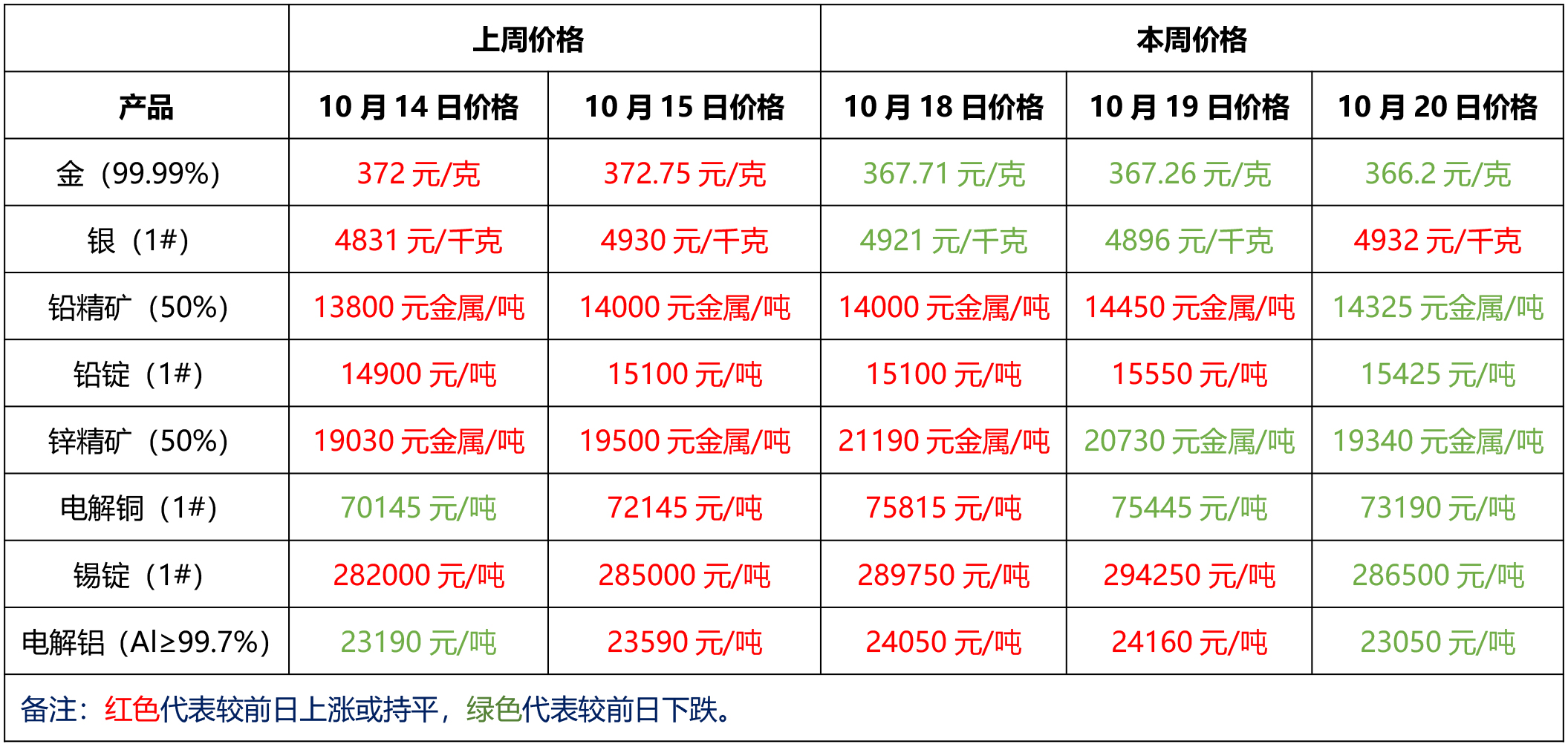 金、銀、鉛、鋅、銅、鋁等主要金屬本周報價