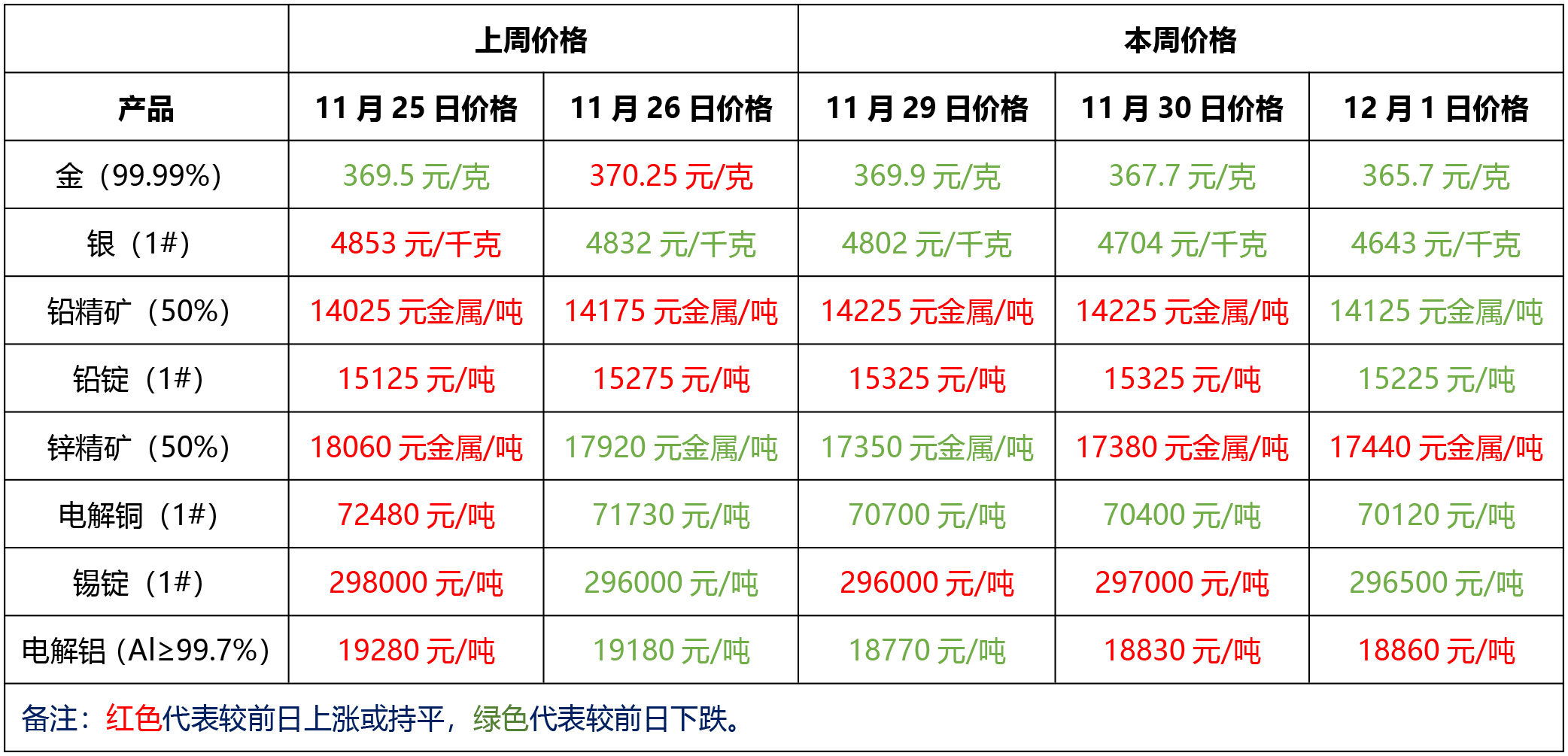 金、銀、鉛、鋅、銅、鋁等主要金屬本周報價