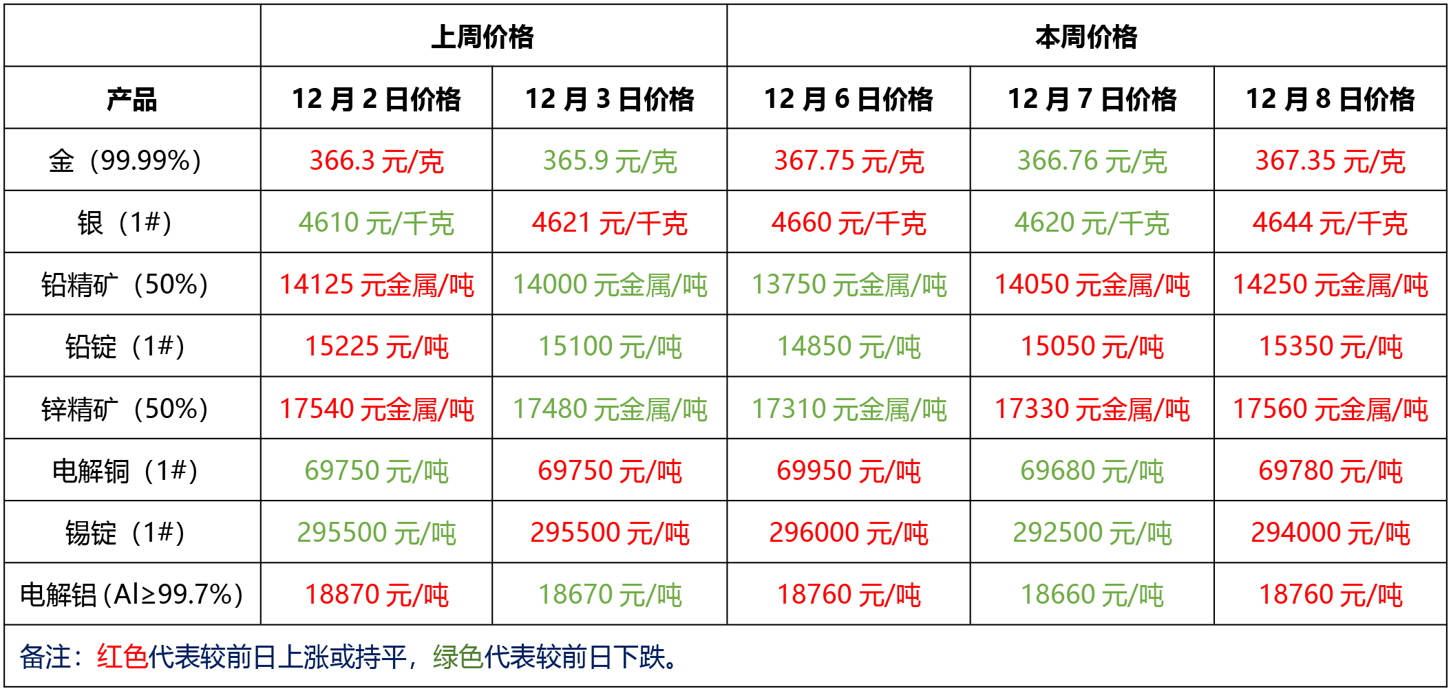 金、銀、鉛、鋅、銅、鋁等主要金屬本周報價